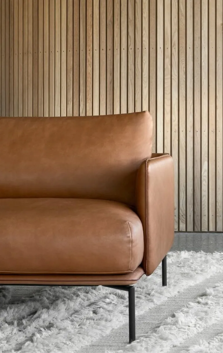 Baron sofa by Adea has an elegant and inviting appearance that results from the combination of sleek, black metal legs and luxurious aniline leather. The uncut pieces of upholstery leather and the viscoelastic cushions with feather pockets give the sofa a puffy feeling.