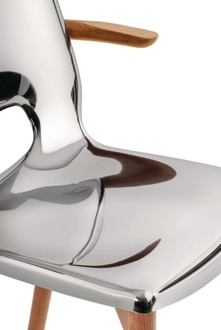 Alessi’s Poêle chair, created by the design maestro Philippe Starck, is a marvel of steel craftsmanship. Imagine rigid sheets transforming into a fluid dance around wooden elements with a distinct identity, seamlessly fitting into diverse environments – homes, offices, or high-end projects.