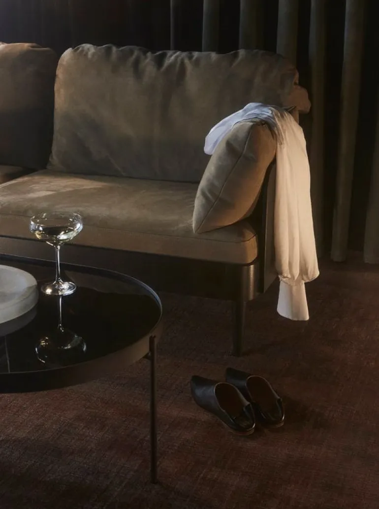 Audo Copenhagen’s NoNo is a light coffee table featuring a colored glass tabletop and slender, rounded metal frame. NoNo is a collaboration of two Scandinavian design teams, Note Design Studio from Sweden and Norm Architects from Denmark, who met by coincidence and noticed that both shared an interest in the combinations of solid tabletops and slender legs. NoNo’s colored, transparent glass top fits easily together with many kinds of sofas, and it also makes an elegant side table or Japanese-style low dining table. NoNo is available in two sizes and different tones.