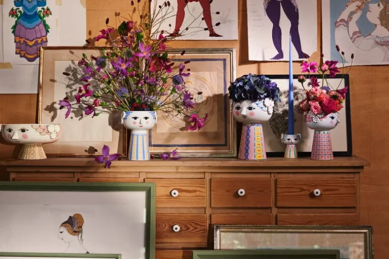 Beloved Danish artist Bjørn Wiinblad, renowned for his magical style and exquisite ornaments, created many feminine characters throughout his career, and perhaps the most famous of them all is Eva. The items of the Eva collection perfectly embody Wiinblad’s exuberant joie de vivre and his appreciation for ornamental beauty, spreading these around wherever they are placed. Eva’s almond-shaped eyes, pointy nose, rosy cheeks and gentle smile are original Bjørn Wiinblad designs, and the ornamental patterns of the dress are interpretations of the artist’s archived illustrations.