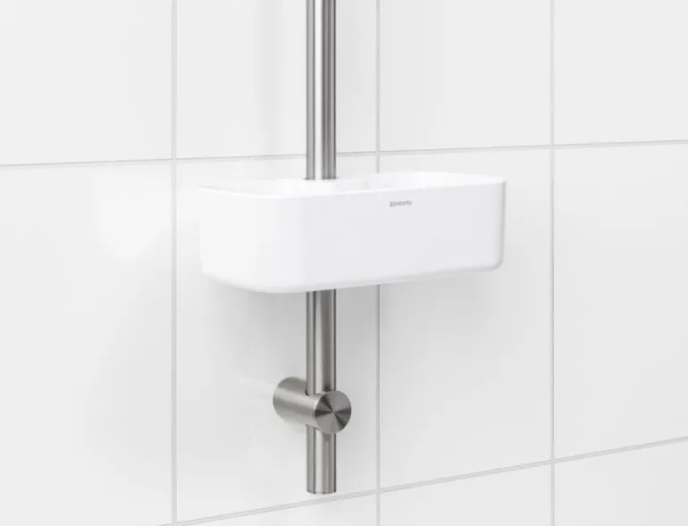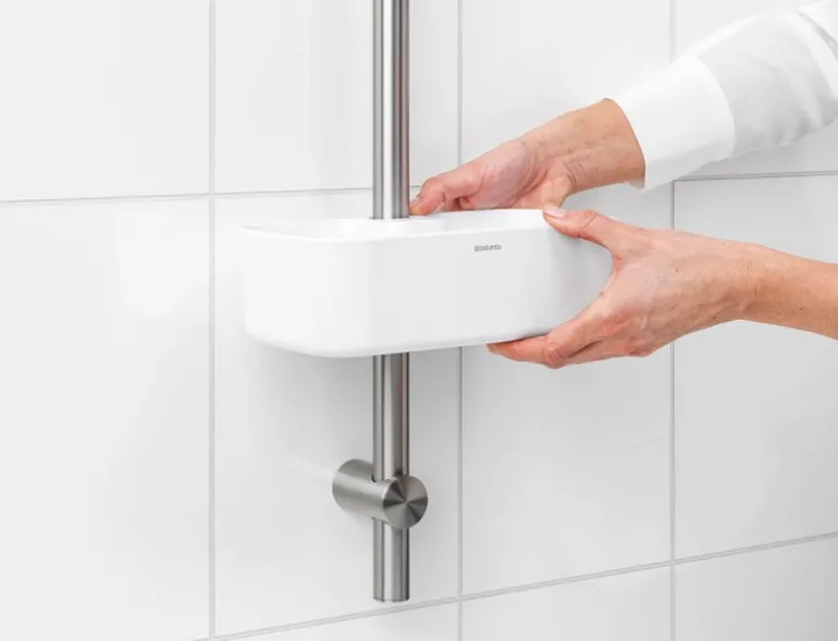 Brabantia’s ReNew shower caddy keeps your shampoo and shower gel always within reach. The caddy is easy to mount on the shower rod at the preferred height, and it holds up to 2 kg – meaning that you can easily fit several bottles in it! The shower caddy has drainage holes on the bottom to keep water from building up inside it.