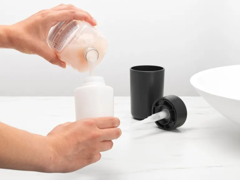 Brabantia’s ReNew soap dispenser is a smart and practical addition to your set of bathroom accessories. Complete with a non-skid base, the stylish and stable soap pump is effortless to refill, thanks to its large opening. Designed with a non-dripping mechanism and removable inner holder, the ReNew soap dispenser is also easy to dismantle and keep clean. With a capacity of 8.45 fl oz (250 ml) and materials selected especially for humid spaces, Brabantia’s soap pump is a sure future favorite.