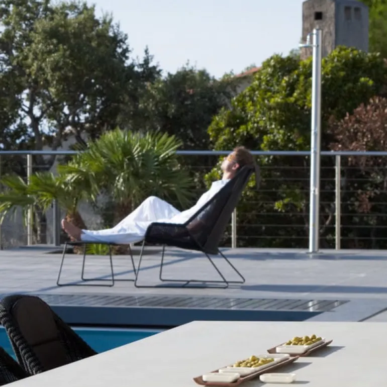 Cane-line’s Breeze highback chair was developed for outdoor use in all weather conditions. Designed by the Danish duo Strand + Hvass, formed by Christina Strand and Niels Hvass, the Breeze highback chair has a sleek steel frame and a light, elegant look. Place the lounge chair on your favorite spot on the patio, sit back and enjoy – you can also pair it with the matching footstool from the Breeze collection.