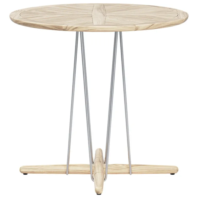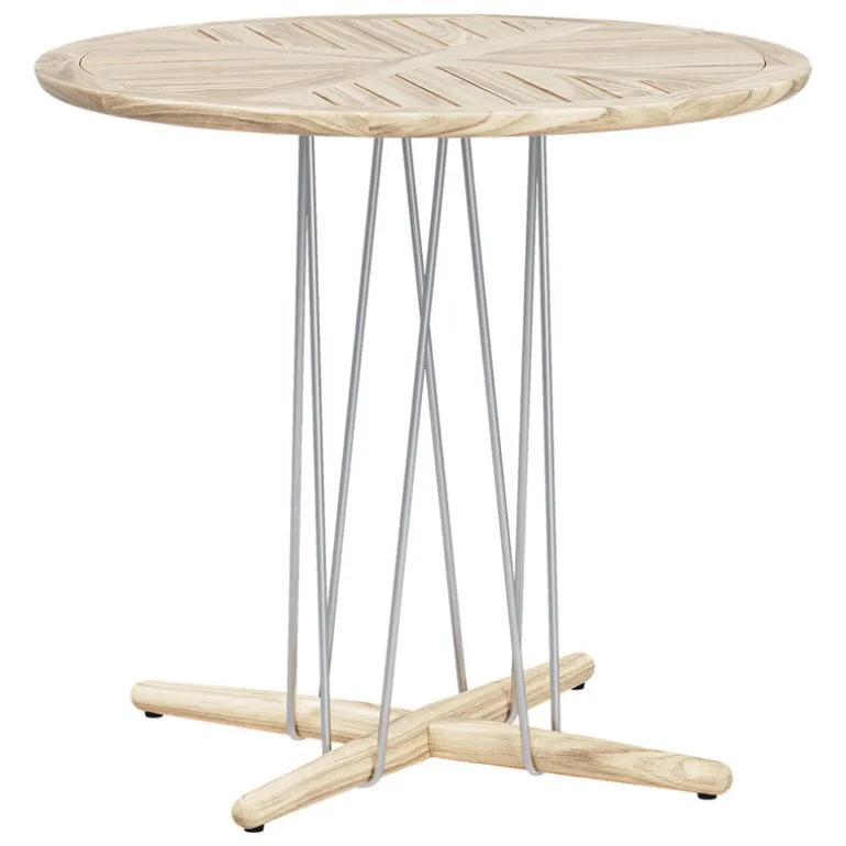 Carl Hansen & Søn’s Embrace E022 dining table delights with its distinctive appearance, a charming combination of wood and steel. Designed by EOOS, the round terrace table features a rigid steel wire alongside a solid base and a tabletop made of wood – the contrast between different materials makes the look of the garden table modern yet natural. This is thanks to the wooden surface: untreated teak will patinate with use and time and become even more unique. If you prefer an original tone, we recommend treating teak furniture with a suitable teak sealant.