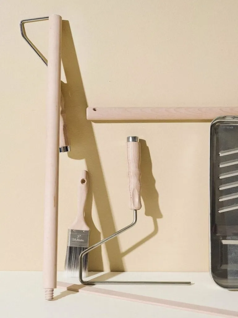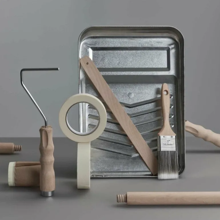 The supplies are designed to serve you again and again whether you’re painting the walls of a new home or redecorating – or redecorating yet again. They are made of high-quality materials: natural beech wood and easily recyclable metal. The brush has synthetic bristles which are best suited for water-based paints; natural bristles would absorb water and swell, possibly leaving the coat of paint uneven.