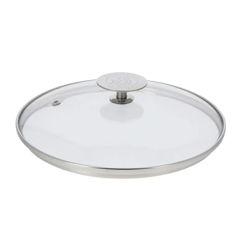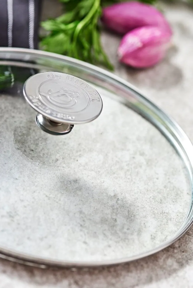 This glass lid is compatible with De Buyer’s 7.87 in (20 cm) Choc Intense frying pan. The lid is ovenproof up to 200 degrees Celsius.