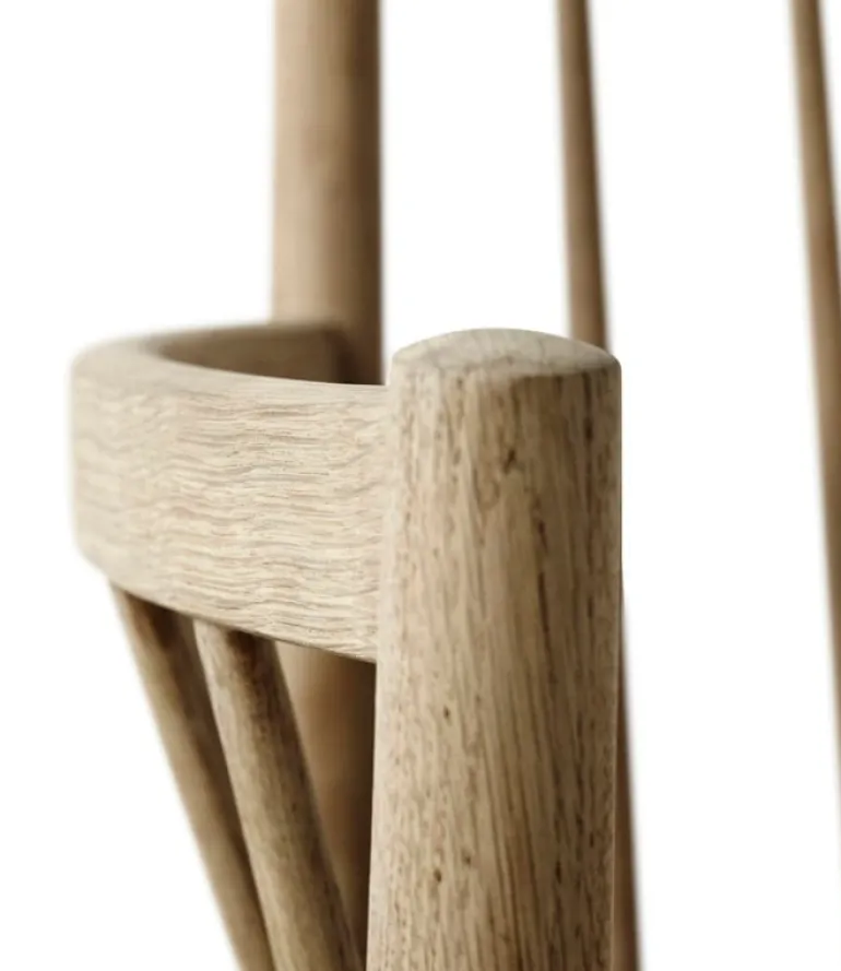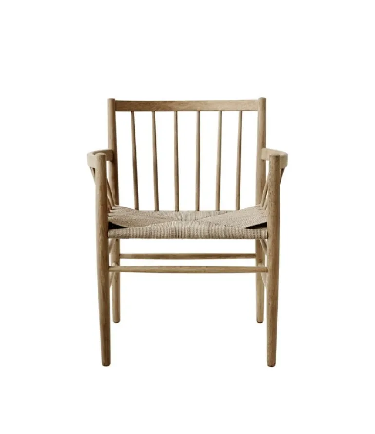 FDB Møbler’s J81 chair, designed by Jørgen Bækmark in 1962, is an attractive wooden spindle back chair based on the 1950s chair collection J80. Featuring an angular frame with distinctive, rounded armrests and back, this solid oak chair is one of the icons of mid-century Danish design. A paper yarn seat complements the natural look of the chair, and its functional form serves many different styles and spaces. The J81 chair shares a similar appearance and materials with other chairs, benches and stools of the J80 collection.