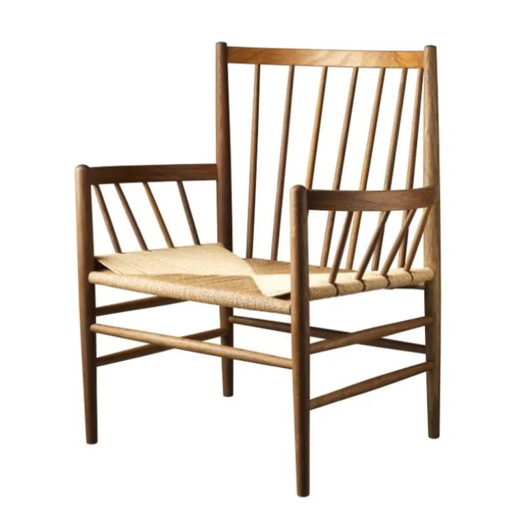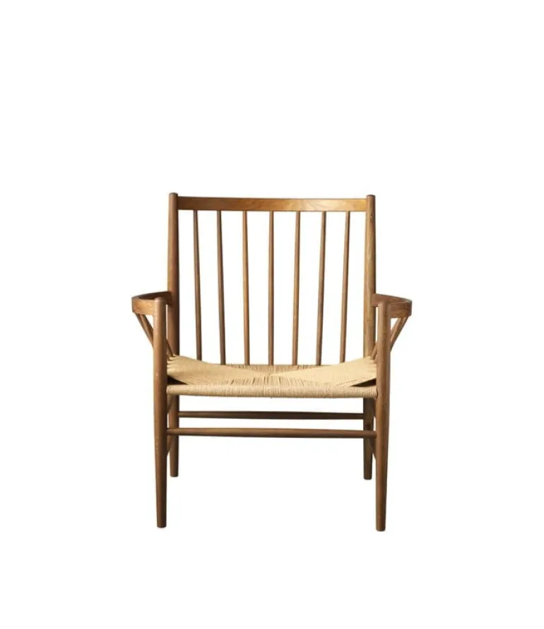 FDB Møbler’s J82 lounge chair, designed by Jørgen Bækmark in 1963, is an attractive wooden spindle back chair based on the 1950s chair collection J80. Featuring an angular frame with distinctive, rounded armrests and back, this solid oak chair is one of the icons of mid-century Danish design. A paper yarn seat complements the natural look of the chair, and its functional form serves many different styles and spaces. The J82 lounge chair shares a similar appearance and materials with other chairs, benches and stools of the J80 collection.