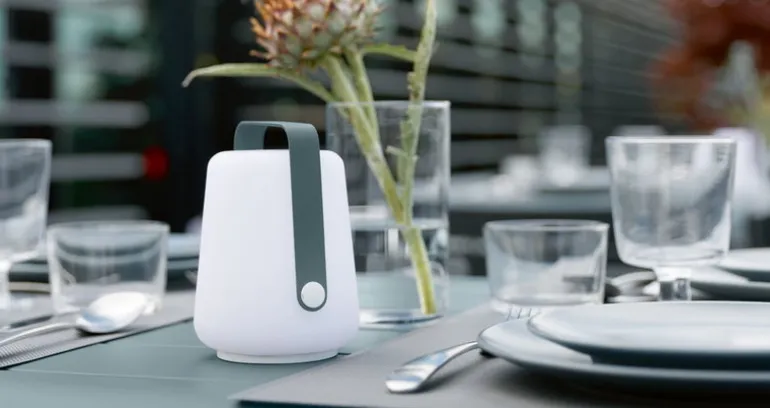 Fermob’s Balad is a fun and versatile light that can be used both indoors and outdoors. With its white streamlined shade and simple handle, the light resembles a pleasant, contemporary lantern. Balad is easy to carry from one place to another since the rechargeable LED technology makes it cordless. The battery lasts up to 14 hours with one charge. Balad lights up any setting with its white light and vibrant colors and makes a great lamp for terraces, gardens and summer cottages.