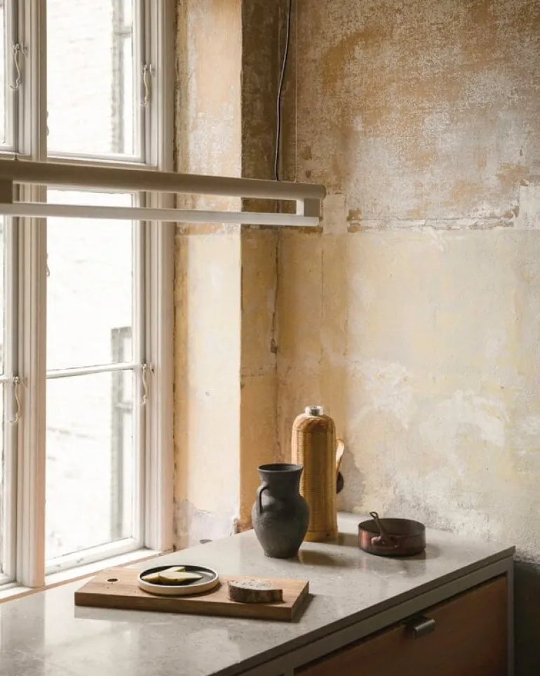 Frama’s Eiffel Single is a minimalist pendant light designed by Krøyer-Sætter-Lassen in 2019, consisting of a steel frame and a tubular LED light source placed underneath it. The opal glass of the bulb filters the light softly and pleasantly, and it is also beautifully reflected from the lamp’s powder-coated steel body. The Eiffel pendant lamp is also dimmable: its light output can be adjusted by turning the brass decoration at the side of the luminaire.