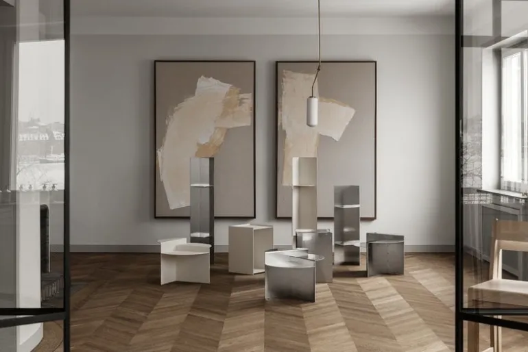 Designed by Jonas Trampedach, the objects of the Rivet collection have been constructed from laser-cut aluminum sheets that are joined together by a hand-hammering technique. The streamlined, geometric shapes of the aluminum sheets give your home a touch of industrial style. Over the years, the raw aluminum surface will develop a vivid patina, and small scratches and color variations will become part of its natural charm.