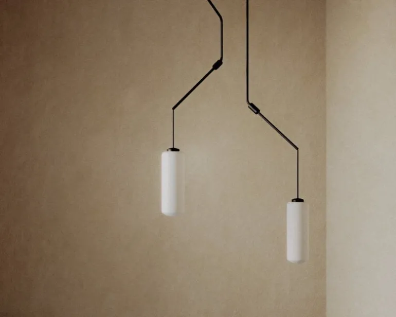 Frama’s Ventus pendant catches the eye with its architectural form conceived by the Danish design duo Included Middle. The pendant light comprises a sculpturally bent suspension tube and a cylindrical shade in opal glass that filters the light softly and pleasantly, creating a warm and inviting atmosphere in the space.