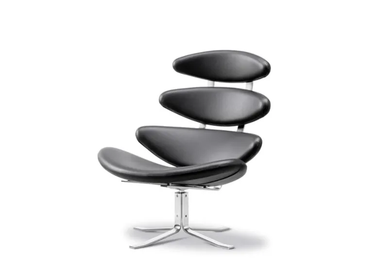Fredericia’s Corona chair is an iconic classic designed by Poul M. Volther in 1964. The legendary lounge chair with an unforgettable silhouette has also appeared in a vast number of films and music videos. The Corona chair consists of four elliptical seat pads and a sturdy matt chrome swivel base, exquisite both in form and function.