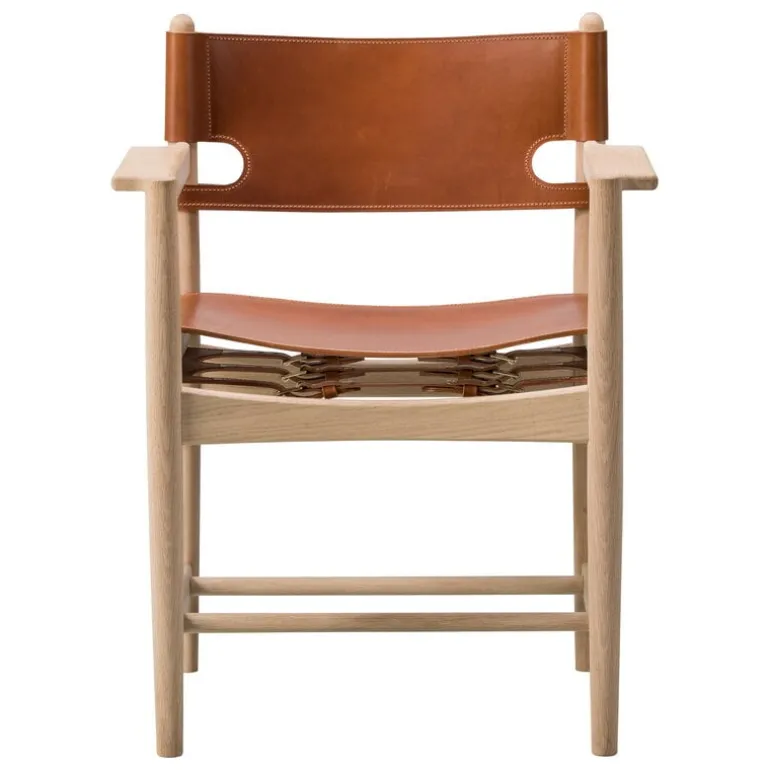 The Spanish Dining Chair by Fredericia was designed by Danish Børge Mogensen as a dining chair version of his classic The Spanish Chair from 1958. When designing the chairs, Mogensen was inspired by a medieval Spanish furniture technique in which saddle leather was attached to a solid wooden frame. This was a technique he often used in his designs, and also the The Spanish Dining Chair consists of a simple oak frame and beautiful saddle leather forming the seat and backrest. Despite of the simplicity of the design, The Spanish Dining Chair catches the eye with its bold hunting lodge esthetics. The chair is available with or without armrests.