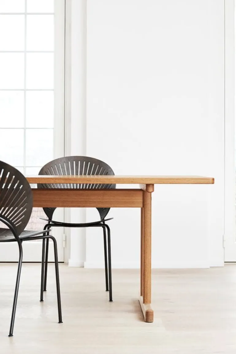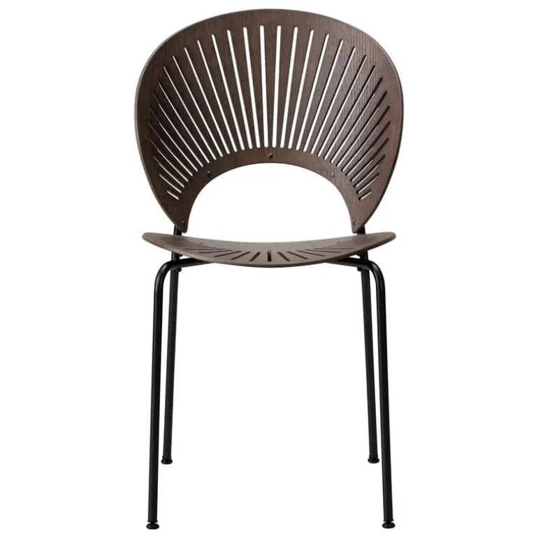 Fredericia’s Trinidad is an attractive, decorative chair designed by Nanna Ditzel in 1993. Trinidad catches the eye with its rounded oak backrest and cutout fretwork which gives the chair a fan-like look and filters the light in a playful manner. The seat has been curved from the sides, making it pleasant to sit even for longer periods, and its delicate appearance is complemented by slim steel legs.
