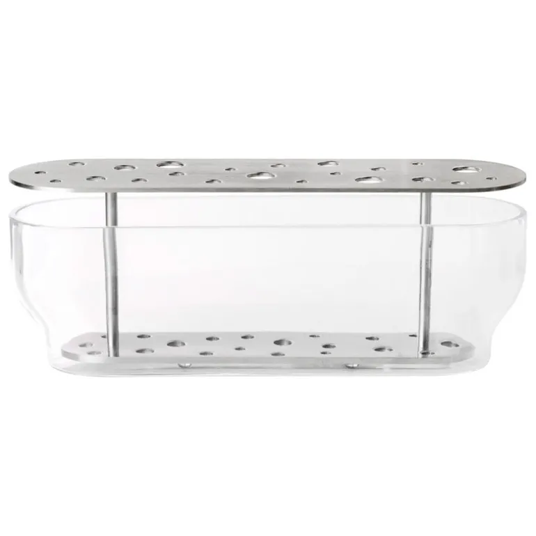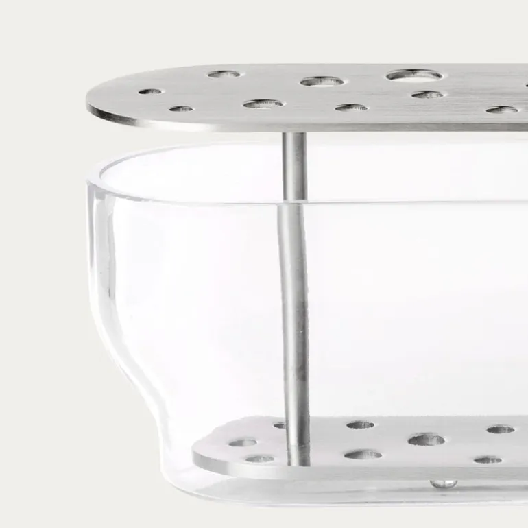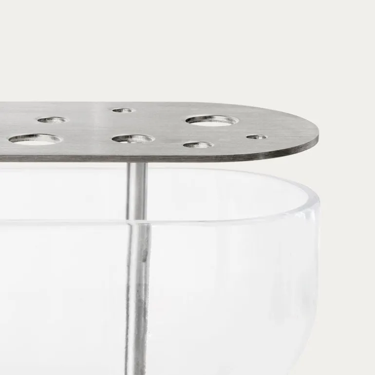 Fritz Hansen’s Ikebana vases, designed by Jaime Hayón, were inspired by the traditional Japanese art of flower arrangement. Hayón’s idea was that you should be able to enjoy the whole flower, not just the blossom: the ingenious design features a mouth-blown glass vase with a steel insert that can be used to arrange the flowers as desired. You can choose whether you want to create a big, lush bouquet or only use a few of the holes in the brass insert.