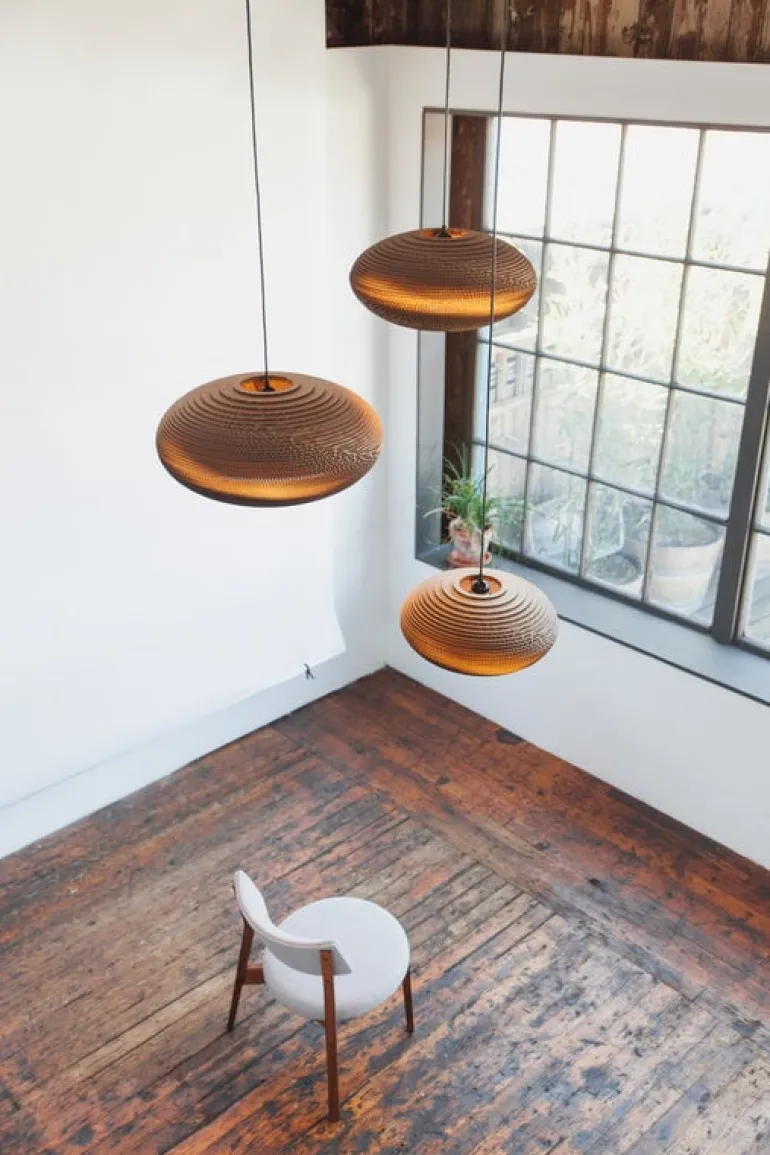 Disc is part of Graypants’ Scraplights collection that features distinctive luminaires made of recycled corrugated cardboard. The material is laser-cut and assembled into the desired shape by hand, using a non-toxic adhesive, and finished with a non-toxic flame retardant. Unique and sustainably manufactured, the Scraplights pendants add a natural, organic touch to any interior both individually and in clusters.