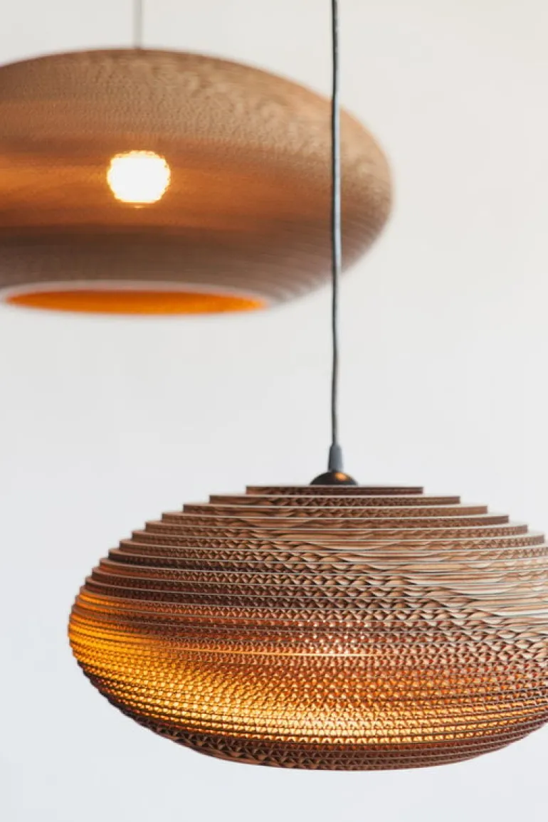 The Disc pendant by Graypants emits a soft, glare-free light that creates a warm and welcoming atmosphere for any space and occasion. The corrugations of the pendant’s oval cardboard shade filter light in a fascinating way and give the lamp a unique texture and appearance also when the light is turned off.