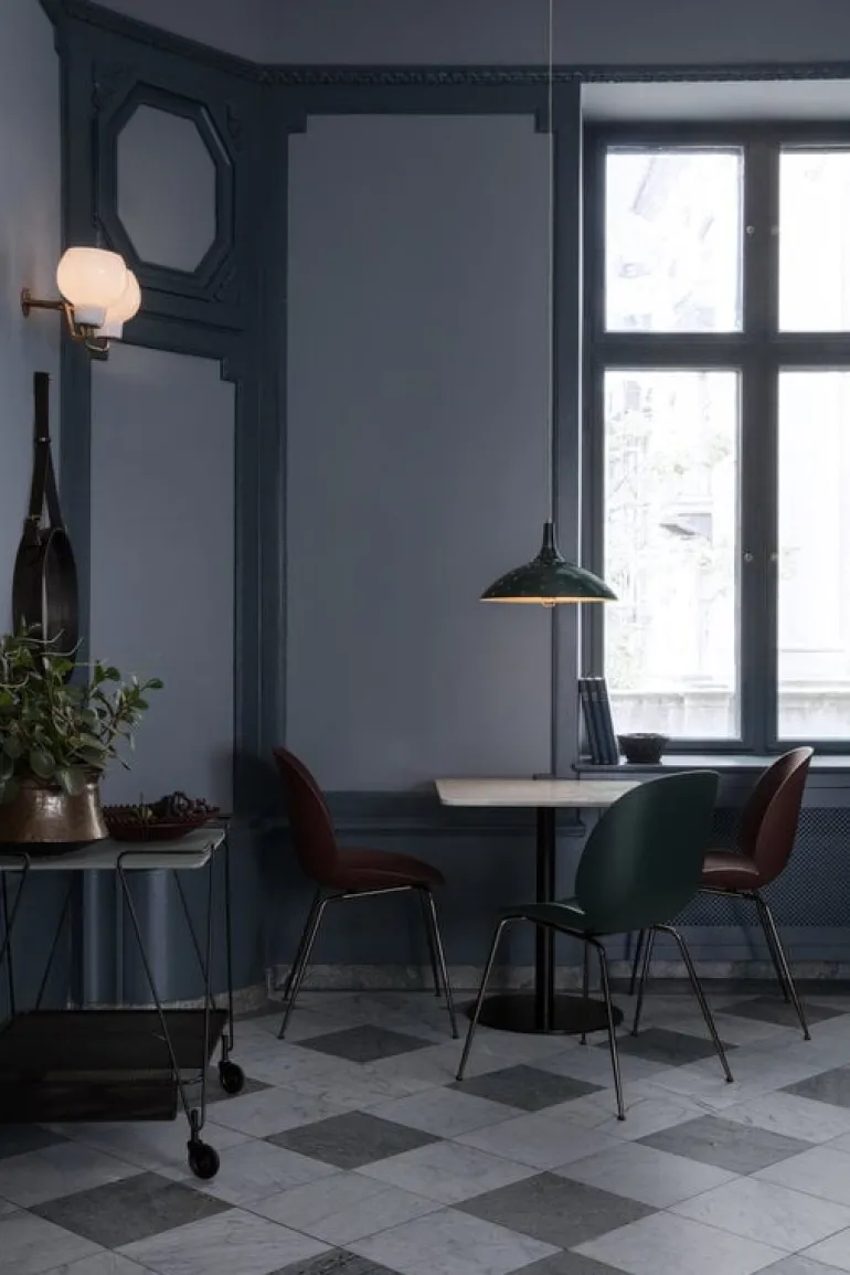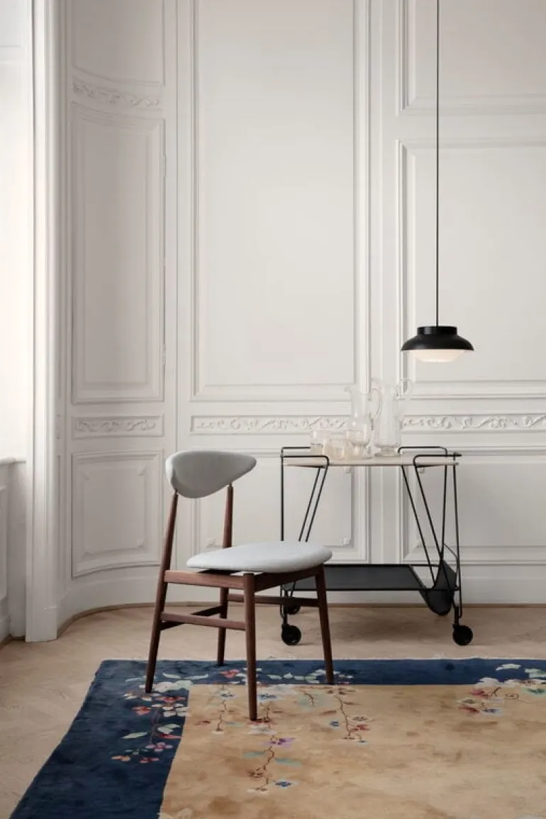 The timeless and graceful Mategot trolley, designed by Mathieu Matégot in 1953-1954 and produced by GUBI, has two trays connected by steel tubes. The lower level includes a magazine holder. The trolley is a perfect extra table for the living room or kitchen. The trolley has rotating castors.