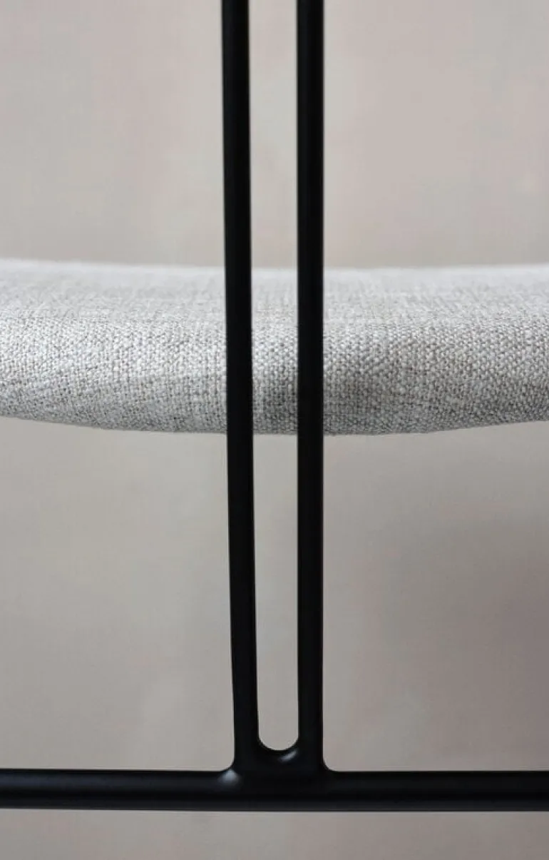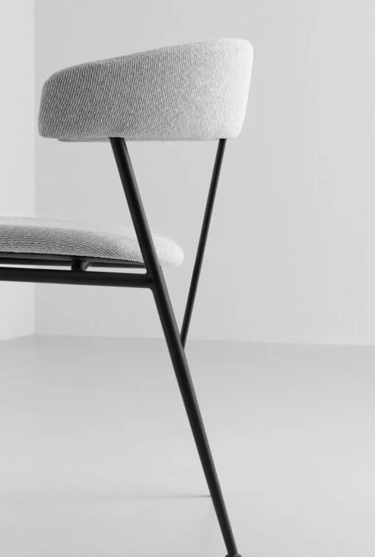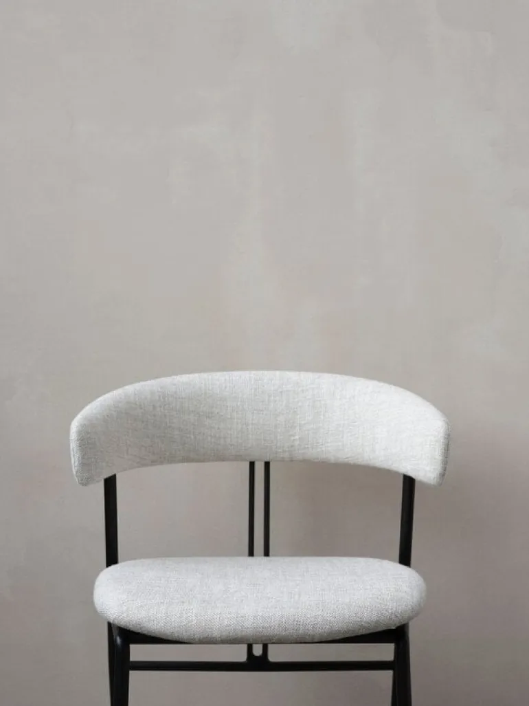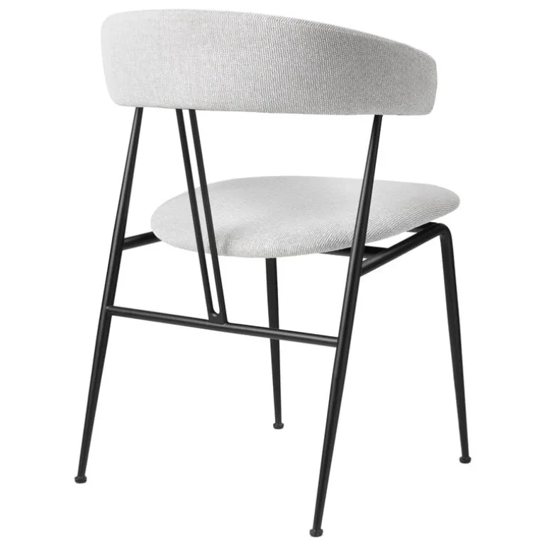 GUBI’s Violin chair, designed by studio GamFratesi, charms with its pure minimalist silhouette, and gentle curvy details. The name of the dining chair refers to two parallel lines on the back resembling the strings of a violin. The powder-coated steel frame and the slender, tapered legs hold the embracing backrest that supports the arms. The contemporary and light appearance of the chair suits well to be deployed in groups around the dining table and the seat provides a comfortable position during meals as well as socializing.
