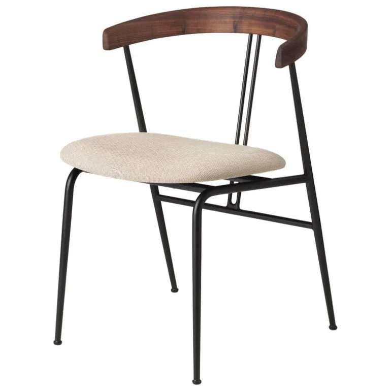 GUBI’s Violin chair, designed by studio GamFratesi, charms with its pure minimalist silhouette, and gentle curvy details. The name of the dining chair refers to two parallel lines on the back resembling the strings of a violin. The powder-coated steel frame and the slender, tapered legs hold the embracing backrest that supports the arms. The contemporary and light appearance of the chair suits well to be deployed in groups around the dining table and the seat provides a comfortable position during meals as well as socializing.