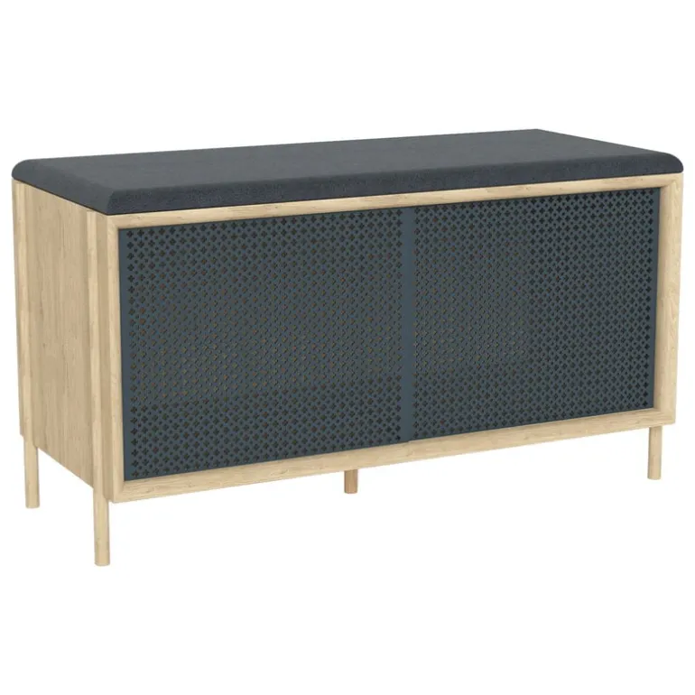 The Gabin bench by the French brand Hartô plays with the contrast of oak-veneered frame and metallic sliding doors. Equally great as a hallway bench or a storage bench in a lounge or dining area, the Gabin bench features a soft seat and plenty of storage space for shoes, books, tableware or items of your choice. The perforated pattern softens the appearance of the doors and gives the bench an atmospheric look.