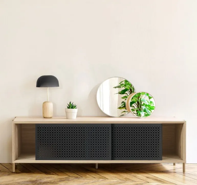 The Gabin sideboard by the French brand Hartô plays with the contrast of oak-veneered frame and metallic sliding doors. The perforated pattern softens the appearance of the doors and gives the sideboard an atmospheric look. Gabin is a modern interpretation of vintage vitrines of the 1960s and its perforated pattern was inspired by wicker traditions. Gabin has been manufactured in Europe.
