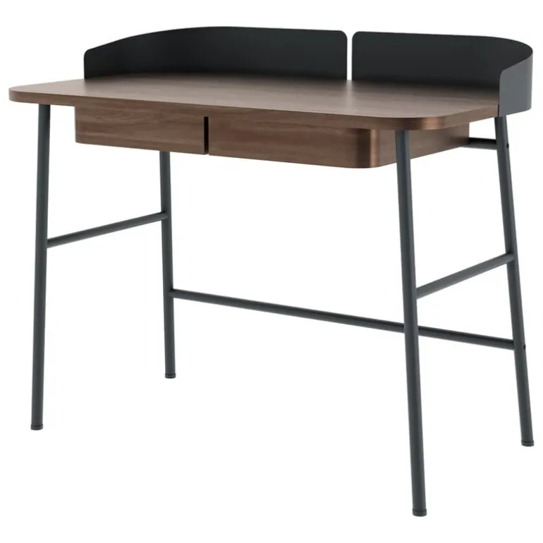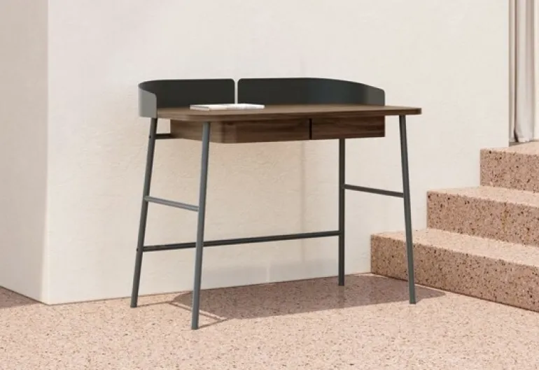 Designed by Pierre-François Dubois for the French brand Hartô, Victor is an attractive and characterful desk consisting of a matt-painted metal frame and walnut-veneered tabletop. Its sleek design and moderate width make it excellent for small working areas, but its large depth provides plenty of working space. The distinctive and practical design is perfected with two drawers and a metallic edge that prevents pens and other items from falling on the floor. Victor has been manufactured in Europe.