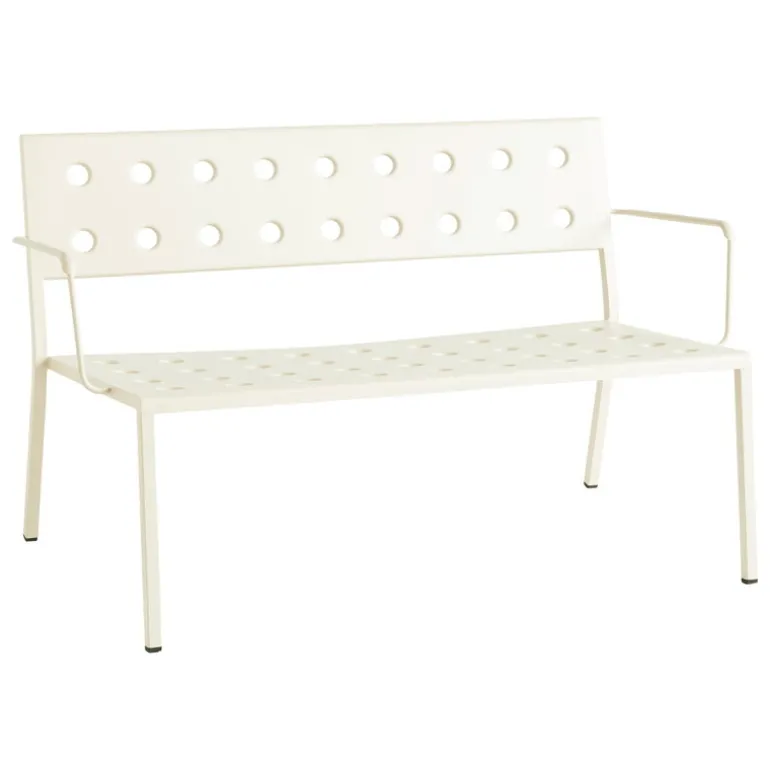 HAY’s Balcony Lounge bench with armrest is part of a clever collection of outdoor furniture designed by the Bouroullec brothers. Made of thin steel sheet, the elegant Balcony outdoor benches and seats are incomparably light and easy to move – a perfect addition to the garden, patio, terrace or balcony. The round holes pressed through the steel plate provide multiple functions: they add character and softness to the geometrical design and allow rainwater to drain off the bench’s surface, while also strengthening the structure of the furniture. Featuring a weather-resistant coating the Balcony collection is as carefree as it looks.