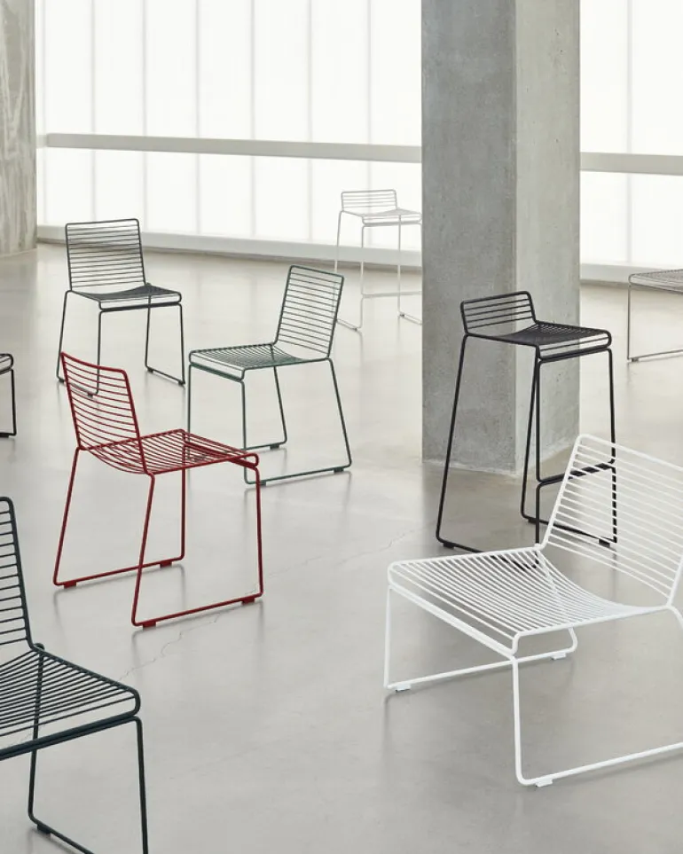 HAY’s Hee bar chair is a contemporary design classic that features an airy metal structure resembling a three-dimensional line drawing. Designed by Hee Welling, the dining chairs, lounge chairs, and bar stools of Hee range will stand the test of time due to their minimalist design and sturdy material: the electro-galvanized and powder-coated steel wire frame makes them suitable also for outdoor use. What’s more, the Hee collection comes in an array of colors fit for any modern décor.