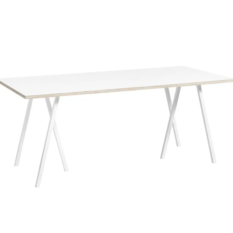 HAY’s Loop Stand table features a rectangular tabletop crafted from laminated plywood, resting on slender metal trestle legs. This capacious trestle table is ideal as a dining table, desk or meeting room table, infusing the space with a blend of natural Nordic style and a minimalist touch drawn from industrial esthetics.