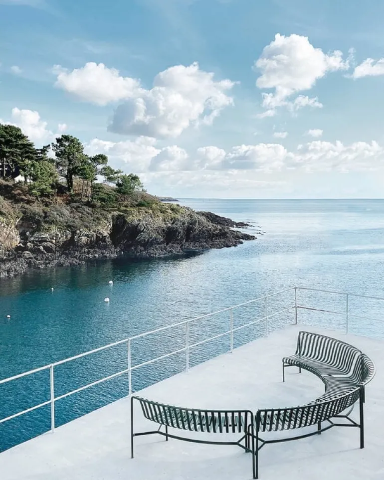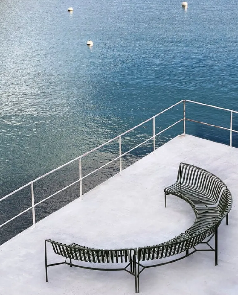 The Palissade Park dining bench add-on is part of HAY’s Palissade Park collection, consisting of modular benches designed especially for larger outdoor spaces and contract use. By connecting two or more benches together, you can create customized seating arrangements in arched, wavy and round configurations. The basic modules of the benches are curved either inward (in) or outward (out).