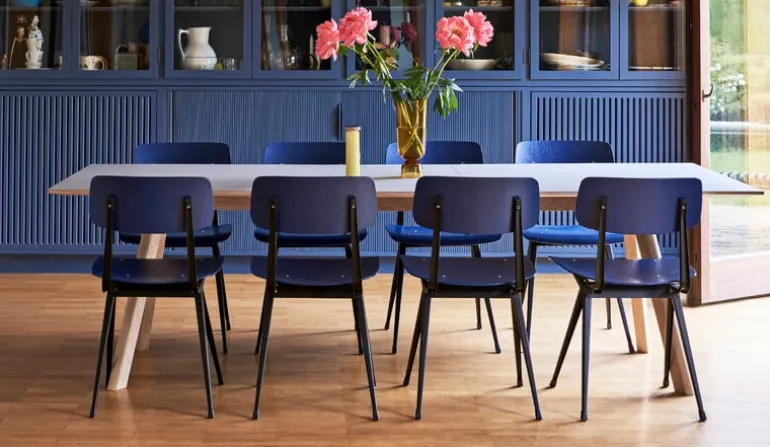 The Result chair, designed by Friso Kramer and Wim Rietveld for Ahrend in the 1950s, has been relaunched by HAY in collaboration with Ahrend. A simplistic combination of sleek steel frame and curved plywood seat and back, Result was regarded in the 50s as a masterpiece in the innovative use of sheet steel, and it has maintained its fresh appearance until today. Thanks to its light and functionalist design, Result used to be a popular chair in Scandinavian schools, and it has been widely used in both public and private contexts. Framer and Rietveld created the Result chair as a pair for the Pyramid table, which makes a perfect match for the chair. Result is available in several different combinations of base colors and wood finishes.