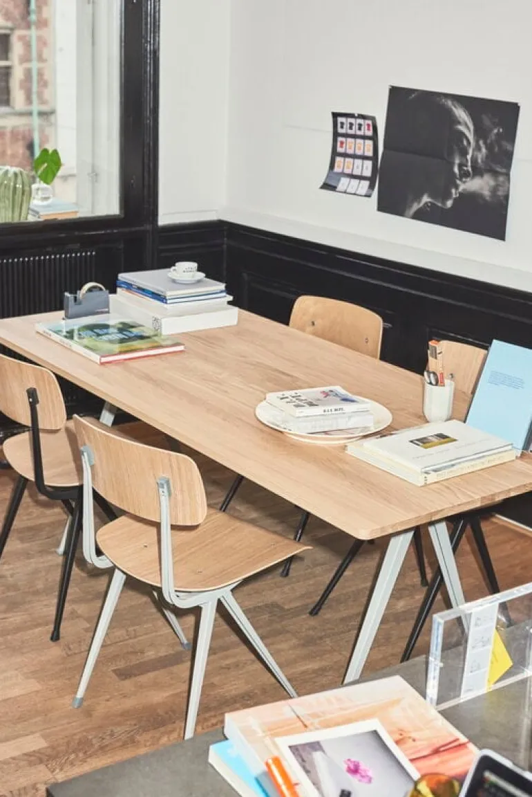 The Result chair, designed by Friso Kramer and Wim Rietveld for Ahrend in the 1950s, has been relaunched by HAY in collaboration with Ahrend. A simplistic combination of sleek steel frame and curved plywood seat and back, Result was regarded in the 50s as a masterpiece in the innovative use of sheet steel, and it has maintained its fresh appearance until today. Thanks to its light and functionalist design, Result used to be a popular chair in Scandinavian schools, and it has been widely used in both public and private contexts. Framer and Rietveld created the Result chair as a pair for the Pyramid table, which makes a perfect match for the chair. Result is available in several different combinations of base colors and wood finishes.