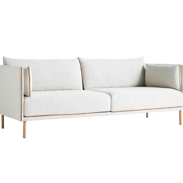 HAY’s Silhouette sofa has a simple and sleek silhouette softened by the smooth curve of its back. Silhouette stands on slim legs in either steel or oak, and it has been upholstered in high-quality fabric. Leather piping details add a graphic touch to the upholstery. Thanks to the light yet capacious structure, Silhouette will find its place in both domestic living rooms and public lounge areas, and its crisp, minimalist look will stand the test of time. Designed by GamFratesi, the Silhouette range is available in many different size, upholstery and leg options.