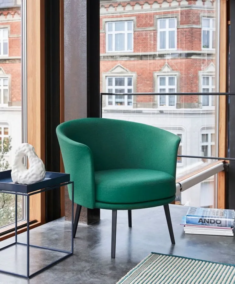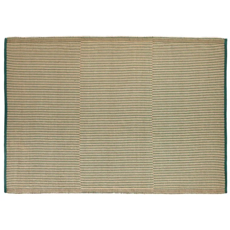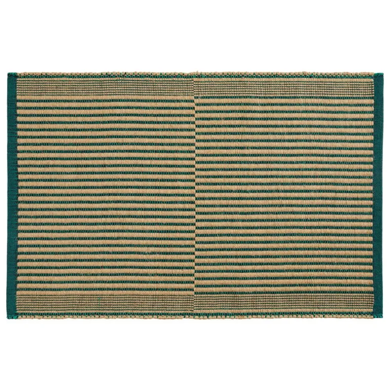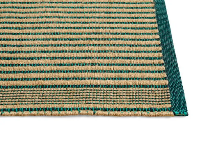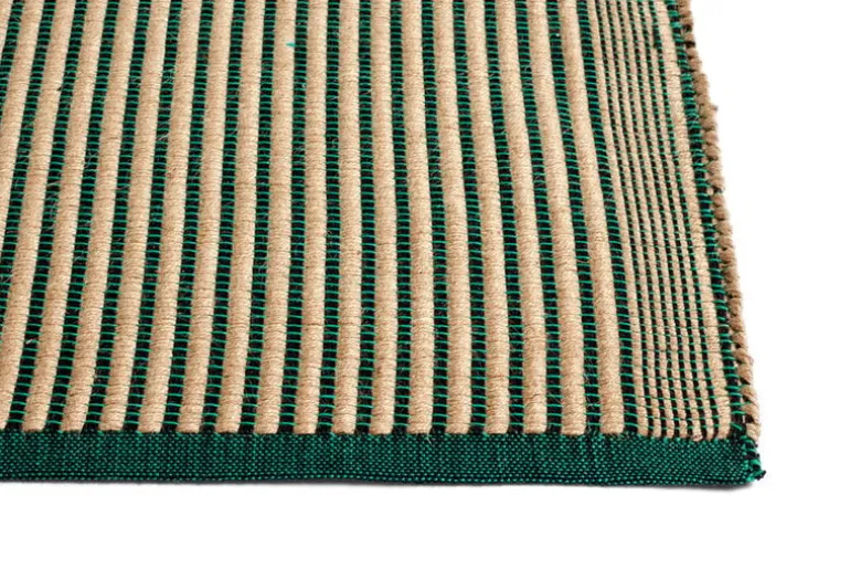 HAY’s Tapis rug, designed by Julie Richoz, has a raw, natural texture that results from a tactile blend of jute and cotton. Seen from a distance, Tapis looks two-toned, but a closer look reveals a surprising detail: the dark green stripes are actually made up of a combination of black and bright green yarn. The rug has a non-slip backing for added functionality.