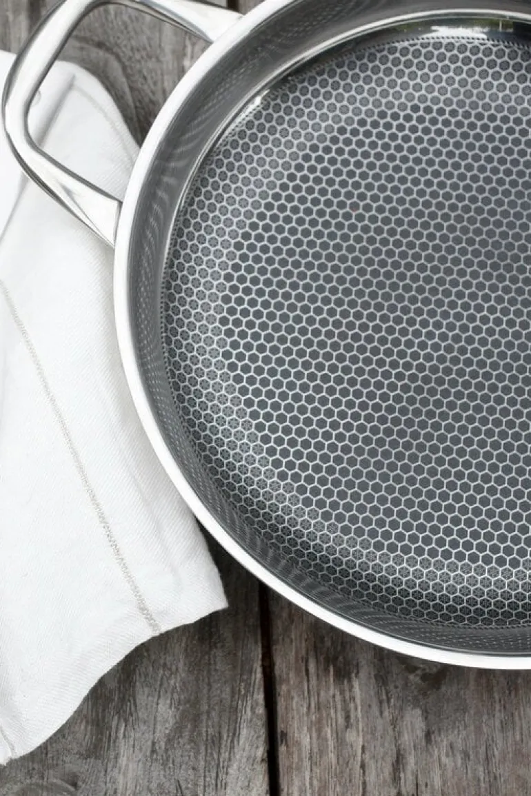 The Steelsafe Pro pan has a safe, completely PFOA-free non-stick coating that makes the pan suitable for frying most foods. The coating also eliminates the need to season the pan. The coating is protected by Heirol’s unique honeycomb base structure – thanks to the protective structure, your utensils do not scrape the coating which means that you can also cook using metal kitchen utensils. The pan is suitable for all hob types and is oven safe up to 260 degrees.