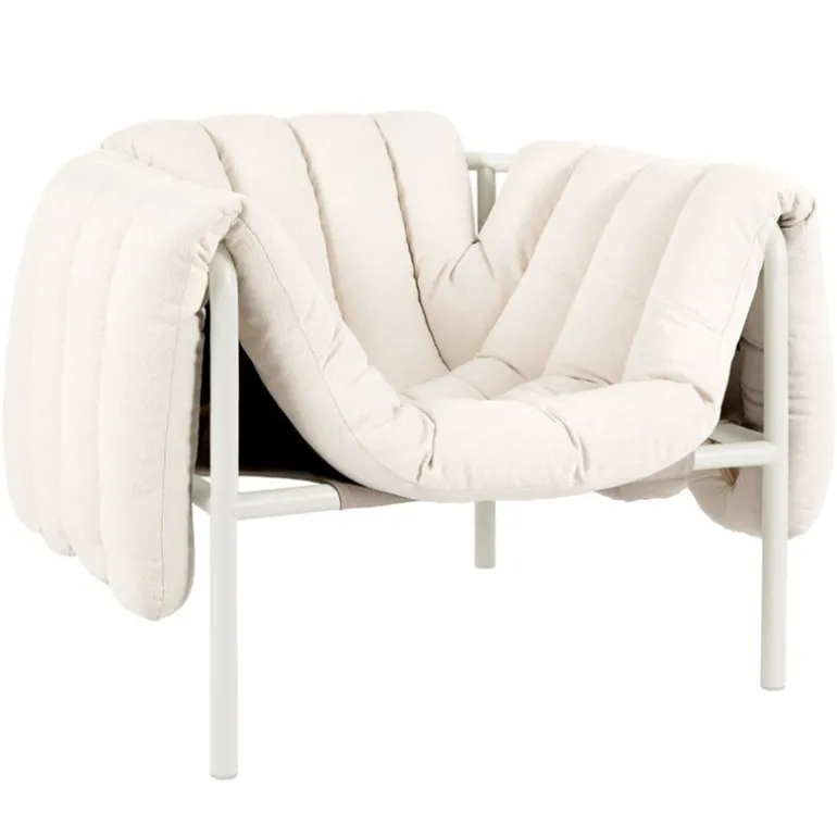 The Puffy lounge chair by Hem charms with a delightful contrast of forms and materials. Designed by Faye Toogood, Puffy consists of a streamlined, tubular steel frame and a plump, detachable upholstery that rests freely on the frame. The playful appearance of the Puffy lounge chair adds a relaxed touch to a living room or lobby, and its airy design easily blends into any kind of decor, minimalist or maximalist. Available in a range of color and upholstery options.