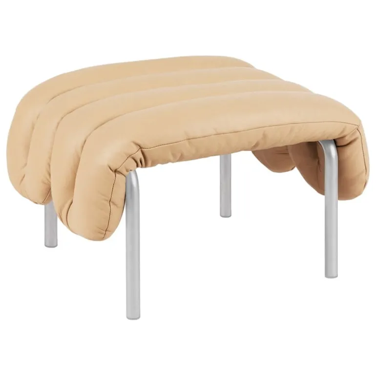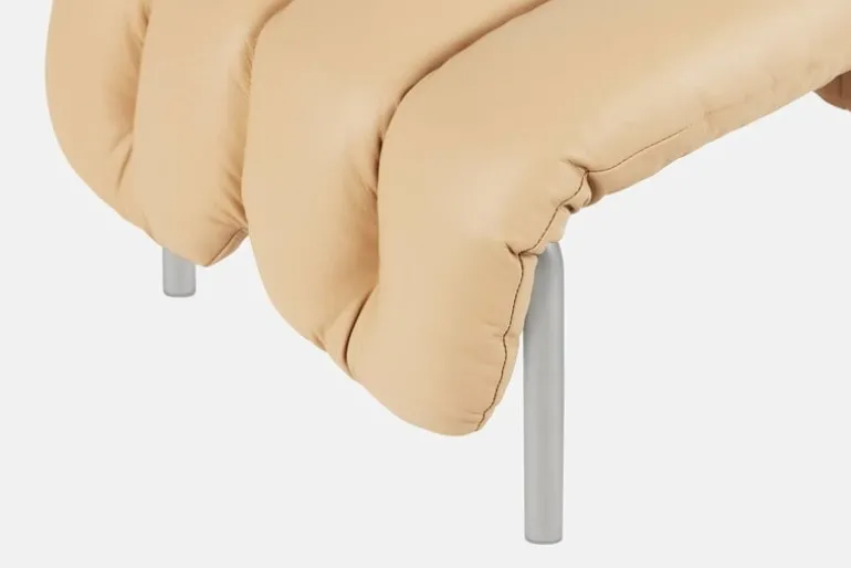 The Puffy ottoman by Hem charms with a delightful contrast of forms and materials. Designed by Faye Toogood, Puffy consists of a streamlined, tubular steel frame and a plump, detachable leather upholstery that rests freely on the frame. The playful appearance of the Puffy ottoman adds a relaxed touch to a living room or lobby, and its airy design easily blends into any kind of decor, minimalist or maximalist. Available in a range of color and upholstery options.