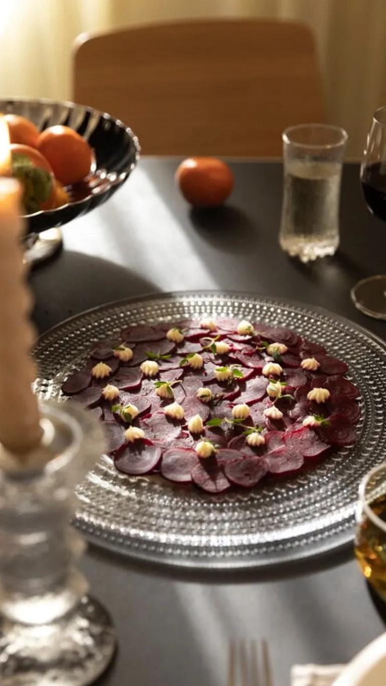In 1964 Oiva Toikka’s aim was to design a pattern that would conceal the joint marks in pressed glass. The result was Kastehelmi, Finnish for dewdrop, that features delicate glass droplets arranged in a series of rings. Kastehelmi became one of Toikka’s most beloved series of glassware and it was manufactured until 1988. The most popular items were brought back into Iittala’s production in 2010. Kastehelmi plays with light in the most beautiful way and suits any table setting.