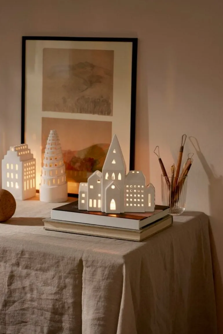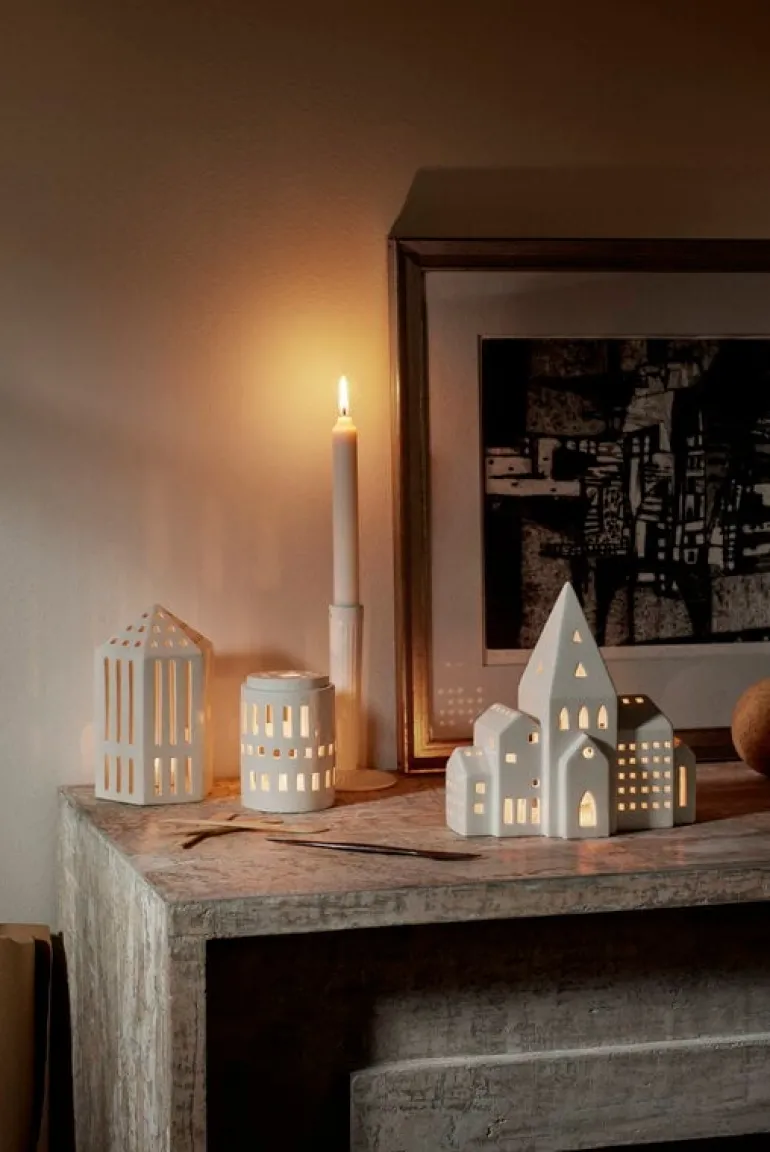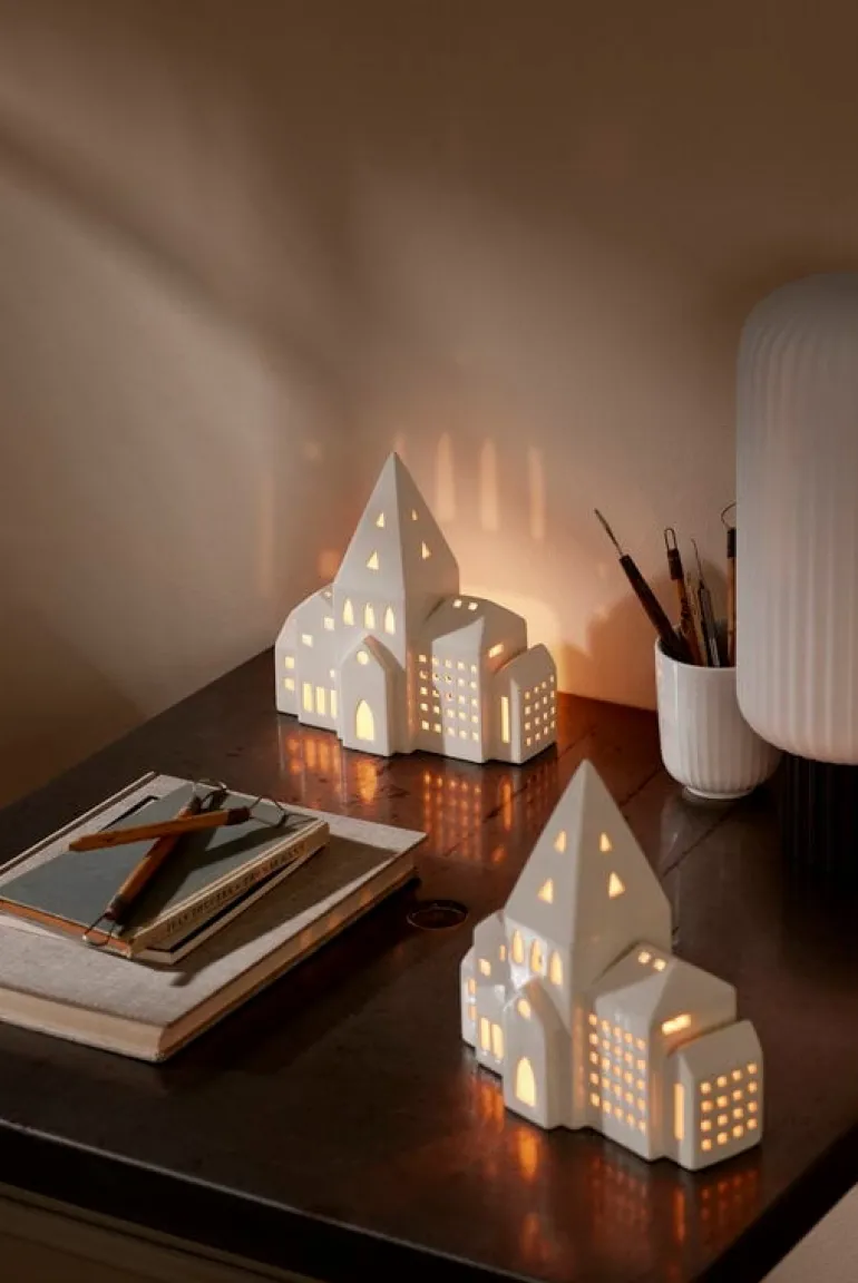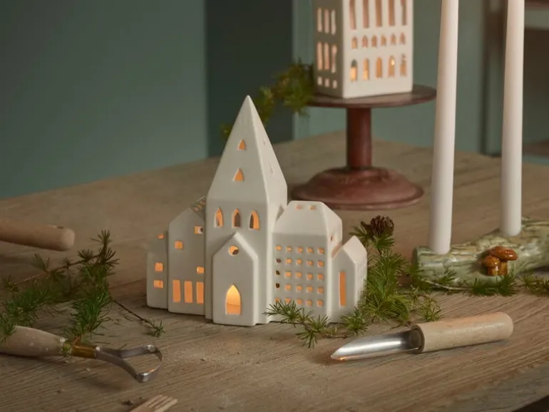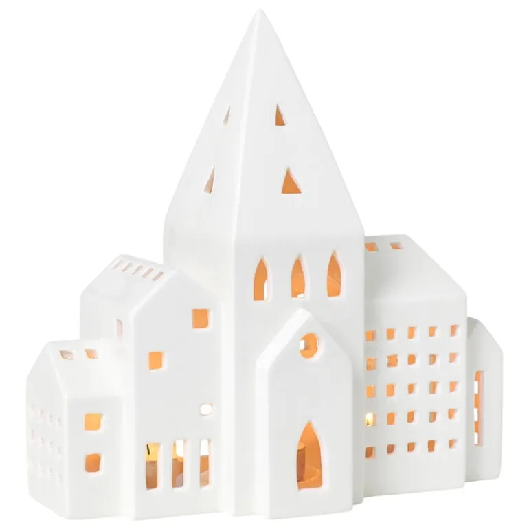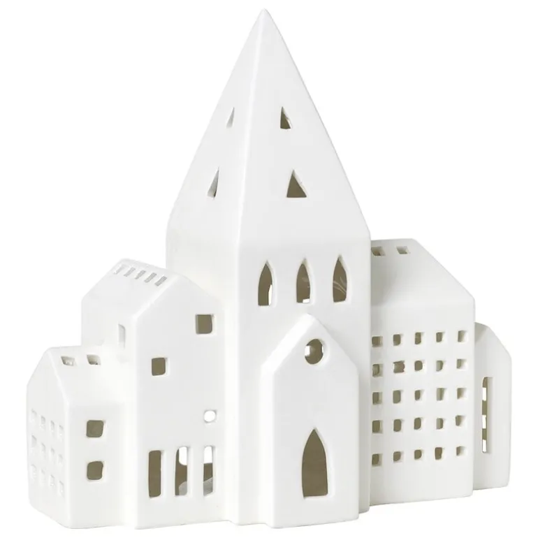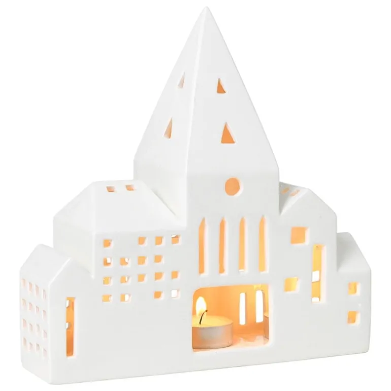 The City lantern from Kähler’s Urbania series depicts a row of city buildings with a high church tower in the middle. Made of ceramics, the lantern is finished with beautiful white glazing.