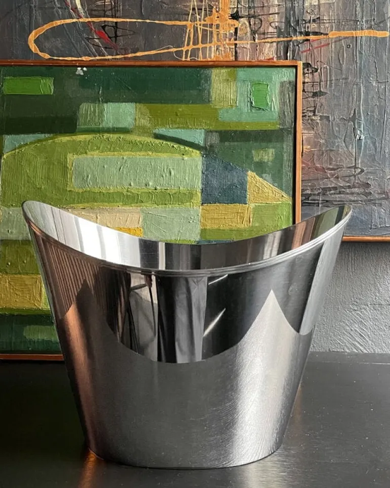 Kay Bojesen’s bottle cooler helps to keep several bottles cool all at once – this generous bottle cooler is twice the size of Bojesen’s original silver cooler. When filled with ice cubes, this bottle cooler is equally great for chilling champagne or beer bottles, as well as serving refreshing drinks at children’s parties or movie nights. The beautifully curved design of the bottle cooler makes it a captivating centerpiece on any festive table, with its polished stainless steel surface reflecting the colors and shapes of the surrounding setting.