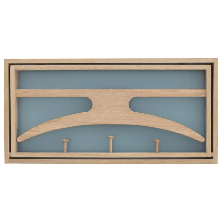 Klassik Studio’s The Hanger, designed by Adam Hoff and Poul Østergaard in 1964, is a clever wall-mounted coat rack and also a small, sculptural art piece. The Hanger features a folding frame with three coat hooks and a rack with hanger. When folded up, the hooks, rack and hanger draw a fun oak-colored pattern on the gray-blue background.