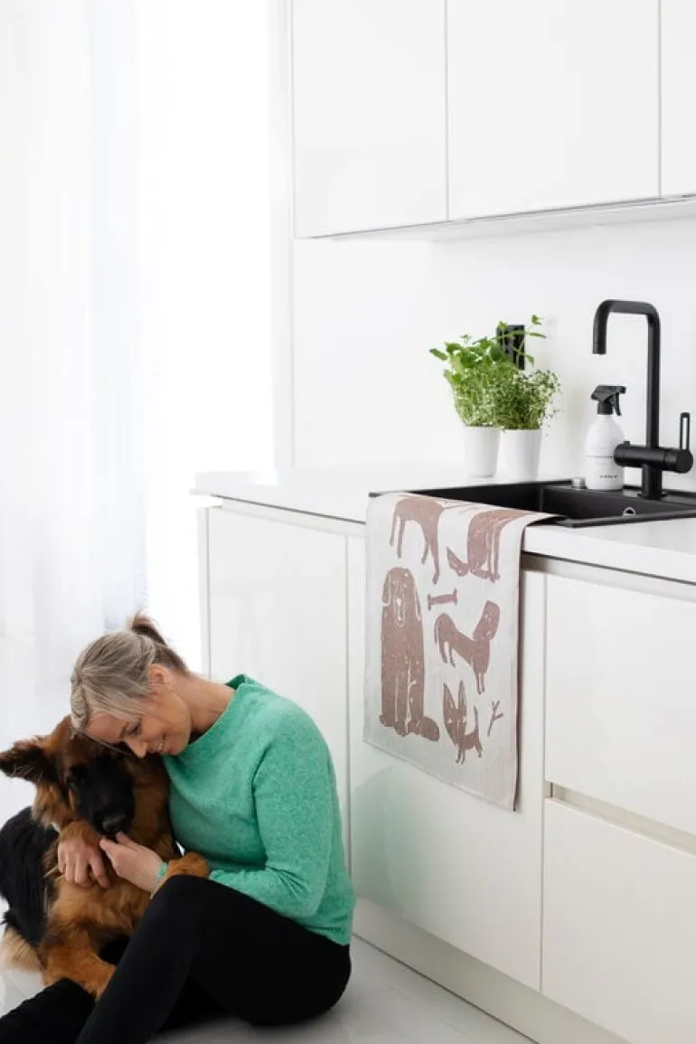 The Koirapuisto tea towel by Lapuan Kankurit is adorned with a joyful pack of dogs drawn by Finnish illustrator Matti Pikkujämsä. Koirapuisto is Finnish for ”dog park”. The black-and-white color palette gives the towel a graphic appearance, and the pattern repeats on the other side with opposite colors. The tea towel is made of a high-quality blend of linen and cotton, and it has been woven in Finland at the own weaving mill of Lapuan Kankurit.