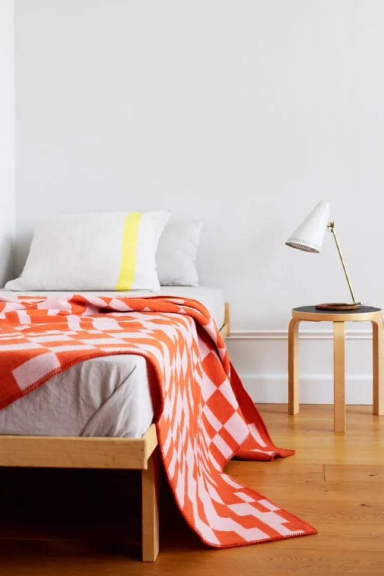 The Koodi blanket by Lapuan Kankurit is decorated with a delightfully asymmetrical checkered pattern designed by Elina Helenius. It is based on one of Helenius’ earlier designs, Huvila, and the extra-long woven fabric she created for the 50th-anniversary exhibition of Lapuan Kankurit in 2023: Koodi presents a detail from the compositions of 4.5-meter-long fabric.