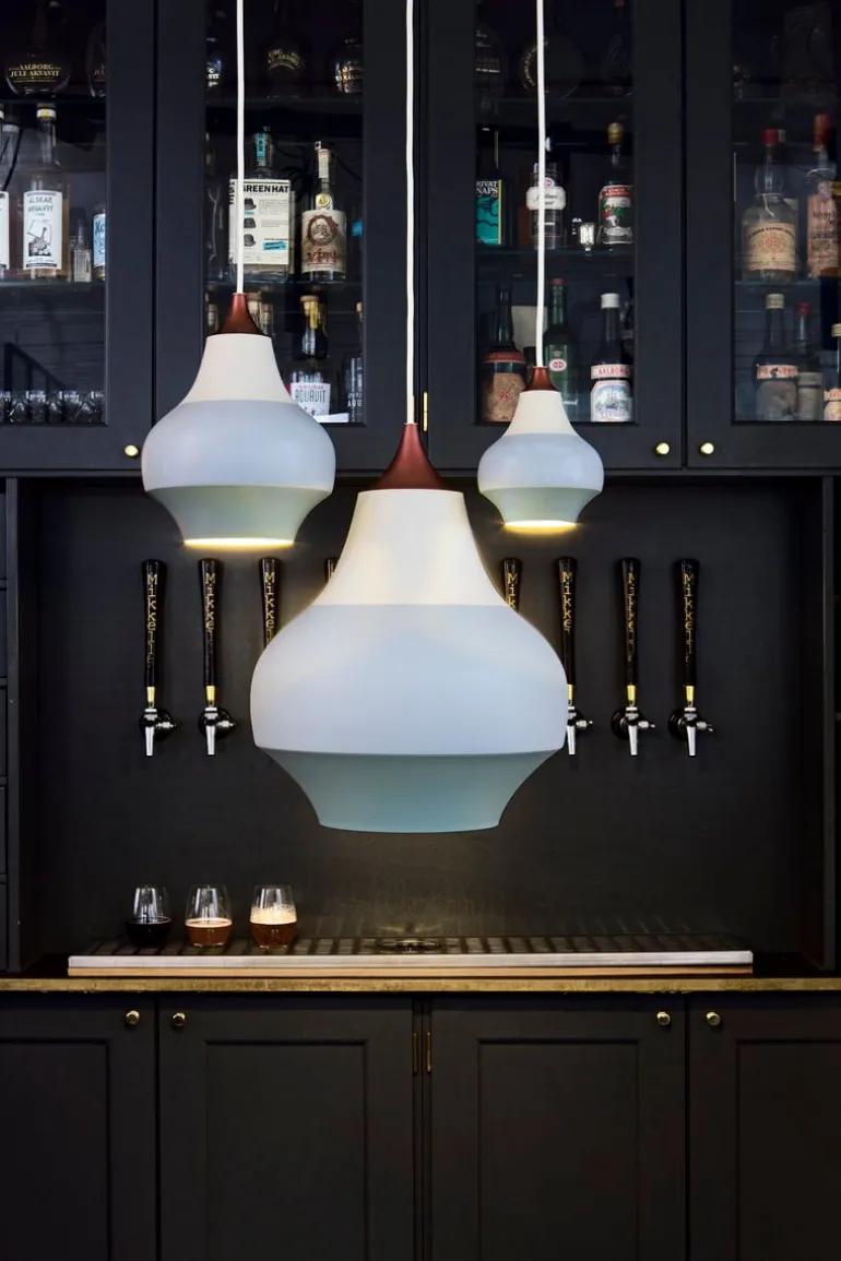 Louis Poulsen’s Cirque is a collection of playful pendant lights, designed by Swedish Clara von Zweigbergk. Their fun, striped appearance was inspired by Tivoli Gardens in Copenhagen: the colors and patterns of carousels and other spinning objects merge into horizontal bands of color when in motion. The delightful design of the shade mirrors the onion-shaped domes, also seen in the amusement park. The Cirque pendant lights provide a pleasant downward light and look great above sofa and dining tables.