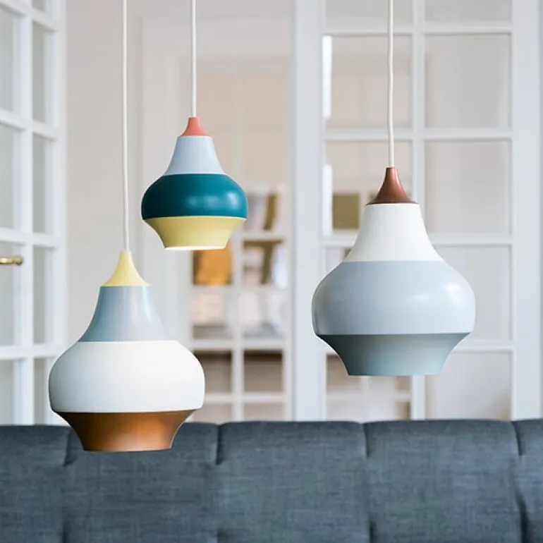 | Louis Poulsen’s Cirque is a collection of playful pendant lights, designed by Swedish Clara von Zweigbergk. Their fun, striped appearance was inspired by Tivoli Gardens in Copenhagen: the colors and patterns of carousels and other spinning objects merge into horizontal bands of color when in motion. The delightful design of the shade mirrors the onion-shaped domes, also seen in the amusement park. The Cirque pendant lights provide a pleasant downward light and look great above sofa and dining tables. |