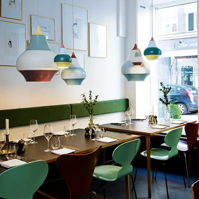 | Louis Poulsen’s Cirque is a collection of playful pendant lights, designed by Swedish Clara von Zweigbergk. Their fun, striped appearance was inspired by Tivoli Gardens in Copenhagen: the colors and patterns of carousels and other spinning objects merge into horizontal bands of color when in motion. The delightful design of the shade mirrors the onion-shaped domes, also seen in the amusement park. The Cirque pendant lights provide a pleasant downward light and look great above sofa and dining tables. |