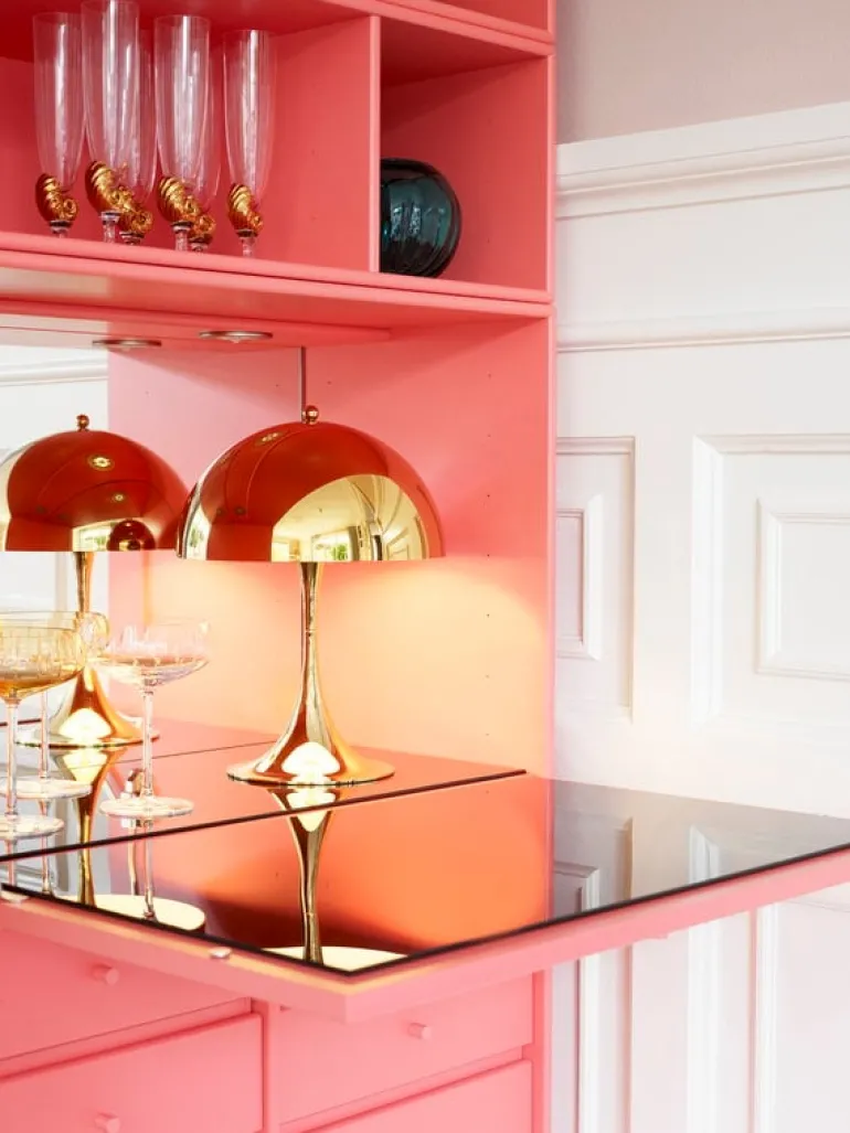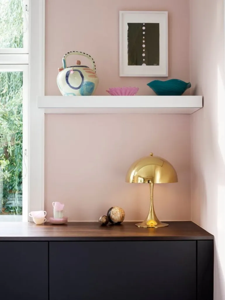 Louis Poulsen’s brass edition of Panthella 250 table lamp features a high-luster surface that reflects its surroundings and emphasizes the sculptural shape of the luminaire.