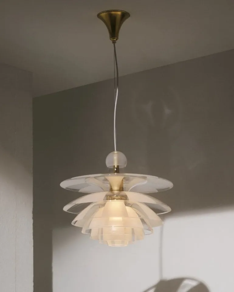 Louis Poulsen’s PH Septima pendant is a breathtaking luminaire created by legendary designer Poul Henningsen in 1927-1931. The exceptional design draws inspiration from Henningsen’s innovative three-shade system developed in the 1920s, adding four extra layers. PH Septima’s seven exquisite shades made from Italian borosilicate glass feature an interplay of frosted and clear sections that underscore the magical look of the luminaire, but also create a soothing, evenly diffused lighting. The brass details give the pendant a refined, sophisticated finish.